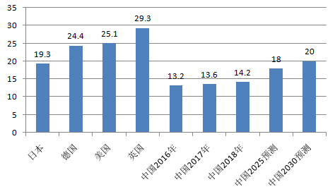 各國2018年新車銷售均價,中國2016-2018新車銷售均價及預測(萬元)
