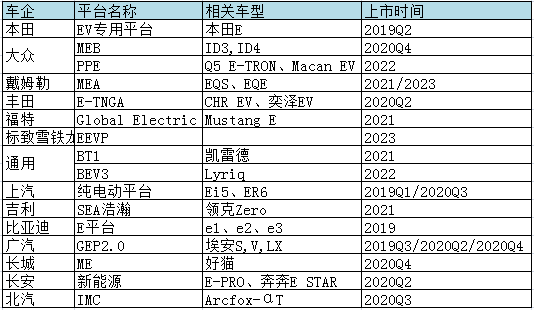 傳統車企的電動化專用平臺車型2020年下半年開始陸續上市