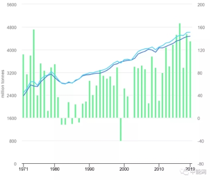 說明:淺藍色曲線為供應,深藍色為消費,綠色柱子為供應和消費之差(多數年份為供大于求)。