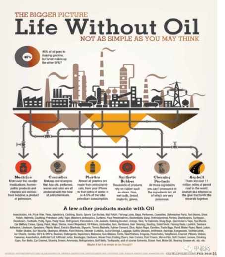 這只是我是有選擇性地挑了一些產品。就想一點,現在塑料和橡膠的應用有多廣泛:汽車的車體(部分)、醫療上的注射器、藥物的容器、水管、一次性飯盒、還有一些離不開的生活用品。可以說現代生活基本上就是建立在石油工業的基礎上的。