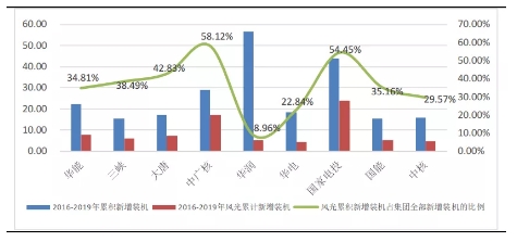 電力央企2016-2019年風光新增裝機占比(GW,%)