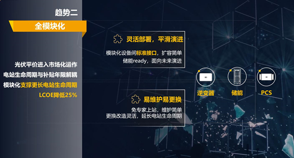 逆變器、PCS、儲能等關鍵核心部件,設備間采用標準接口,靈活擴容,快速部署;逆變器不管交流還是直流側,具備儲能接口,面向未來演進。同時隨著光伏電站規模和復雜度越來越高,專家上站維護的傳統模式成本過高。模塊化設計可以實現免專家維護,極大降低運維成本、提升系統可用度。全模塊化設計將成為行業主流。