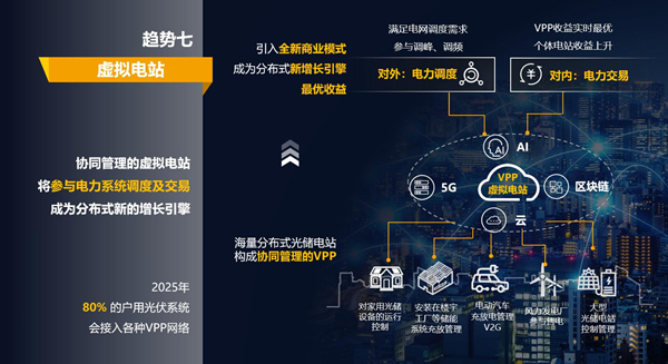 5G、區塊鏈、云服務等ICT技術的大規模應用于分布式電站,組成協同管理的虛擬電站參與到電力系統的調度、交易與輔助服務中。未來5年,虛擬電站技術的發展會在分布式光伏場景中衍生出新的商業模式,以及新的市場參與者,成為分布式新的增長引擎。預計2025年,80%的戶用光伏系統會接入各種VPP網絡。