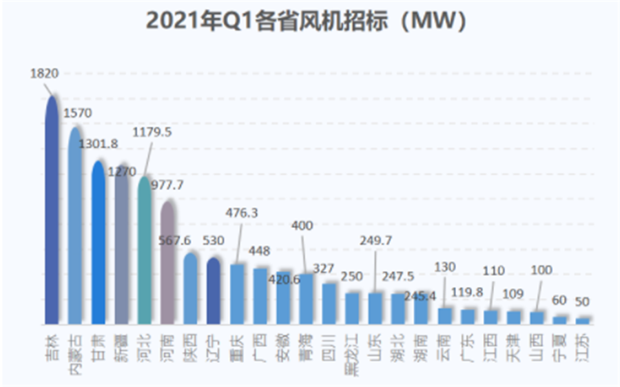 24個省份發布了風機招標。其中,有四省招標容量均超1GW,分別為吉林(1820MW)、內蒙古(1570MW)、甘肅(1301.8MW)、河北(1179.5MW)。