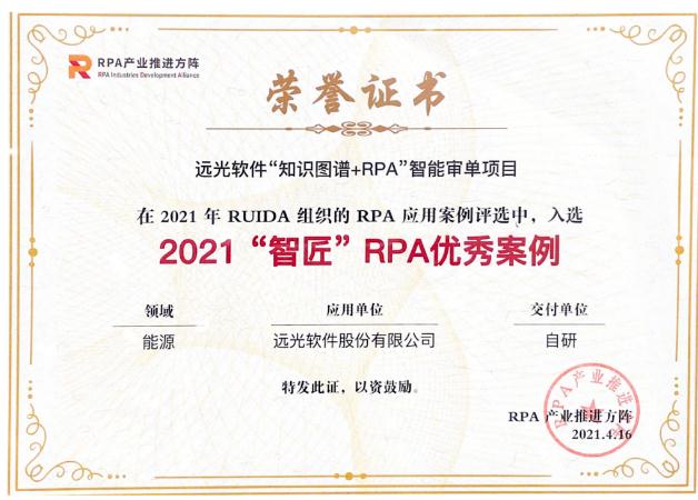 近日,以“重塑數字生產力,賦能 IT 新時代”為主題的“2021 RPA 創新產業峰會(RIIS)”在北京召開。遠光軟件作為RPA+AI領域的領軍企業受邀出席大會,其“知識圖譜+RPA”智能審單項目案例榮獲大會頒發的“2021‘智匠’RPA優秀案例”獎。