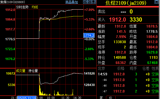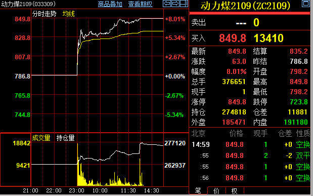 “漲停了,漲停了”。5月6日,勞動(dòng)節(jié)后上班第一天,動(dòng)力煤和焦煤市場(chǎng)交易一片火爆景象。在動(dòng)力煤期貨市場(chǎng)上,各期限合約紛紛上漲,主力合約價(jià)格達(dá)到了849.8元/噸,尾盤漲幅突破8%,刷新歷史高點(diǎn)。