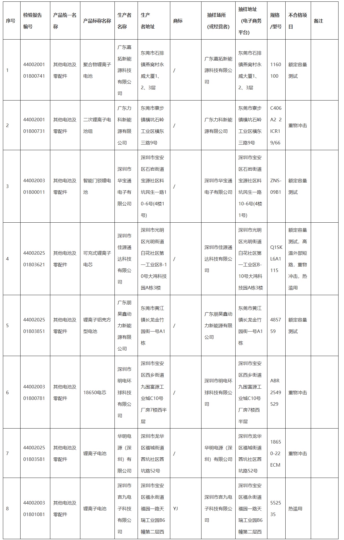本次抽查重點對開路電壓、泄漏和變形、放電性能、運輸-沖擊、運輸-振動、不正確的安裝、外部短路、過放電、自由跌落、熱沖擊、強制放電、非正常充電、熱濫用、重物沖擊等43個項目進行了檢驗。經檢驗,發現8家企業生產的8款產品不合格。不合格項目主要有:“額定容量測試”“重物沖擊”“高溫外部短路”“熱濫用”。不合格產品名單見附件。