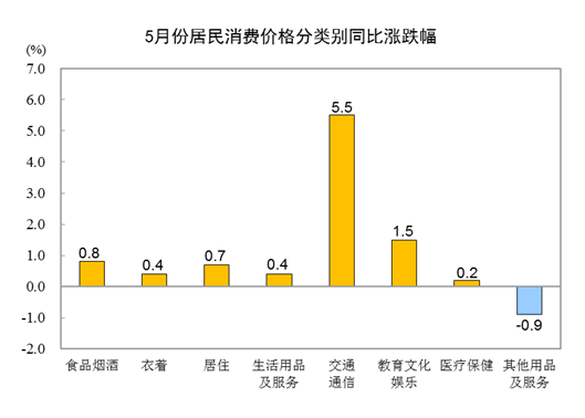 其他七大類價格同比六漲一降。其中,交通通信、教育文化娛樂、居住價格分別上漲5.5%、1.5%和0.7%,衣著、生活用品及服務、醫療保健價格分別上漲0.4%、0.4%和0.2%;其他用品及服務價格下降0.9%。