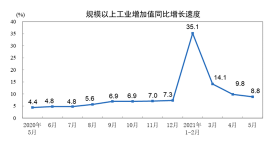 5月份,規模以上工業增加值同比實際增長8.8%(以下增加值增速均為扣除價格因素的實際增長率),比2019年同期增長13.6%,兩年平均增長6.6%。從環比看,5月份,規模以上工業增加值比上月增長0.52%。1—5月份,規模以上工業增加值同比增長17.8%,兩年平均增長7.0%。
