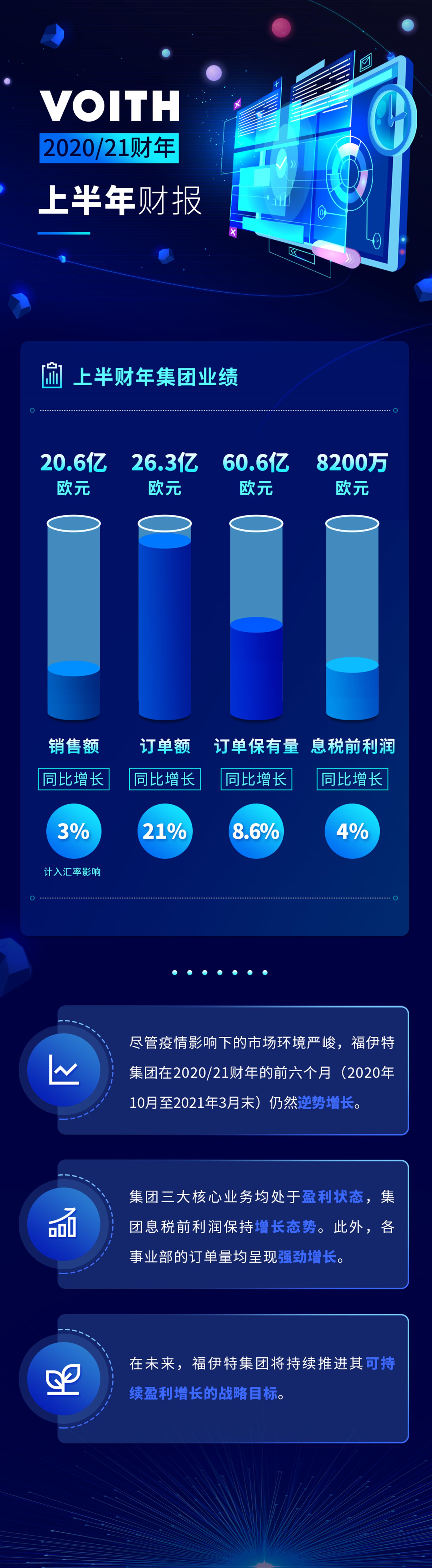 福伊特集團首席執行官托福·賀格博士(Dr. Toralf Haag)表示:“盡管疫情造成明顯的負面影響,福伊特集團的運營和財務狀況仍然表現穩健。去年同期,疫情的不利影響持續了兩個月;而在本財年,我們整個上半年都處在疫情沖擊之下。因此,我們對目前取得的業績十分滿意。疫情期間,集團多元化的行業布局和廣泛的地域分布使我們順利渡過危機。從長遠來看,福伊特集團將繼續在可持續盈利增長的道路上穩步前進。”