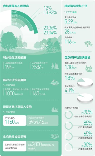 一片片荒原變綠,一個個沙丘止步,一座座青山連綿起伏。從森林匱乏到人工林面積世界第一,從“沙進人退”到“綠進沙退”,神州大地不斷綠起來美起來,城鄉人居環境不斷改善。