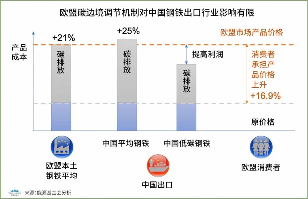 根據能源基金會與Sandbag、E3G的聯合研究分析,假設歐盟碳邊境調節機制全部生效,以2019年為例,中國出口歐盟的鋼鐵產品貿易額約47億歐元,將被征收約2.65億歐元碳邊境調節稅(基于2035歐盟完全取消免費配額、每噸二氧化碳征收60歐元情景);相同情況下,歐盟向土耳其進口的鋼鐵征收的碳邊境調節稅將達到7億歐元。初步分析顯示,歐盟完全取消免費配額將造成鋼鐵成本增加21%,而碳邊境調節機制會導致中國向歐盟出口的鋼鐵成本增加約25%。但是對于碳排放較低的鋼鐵可以按照實際碳排放征收碳邊境調節稅,從而增加低碳鋼鐵的競爭力。