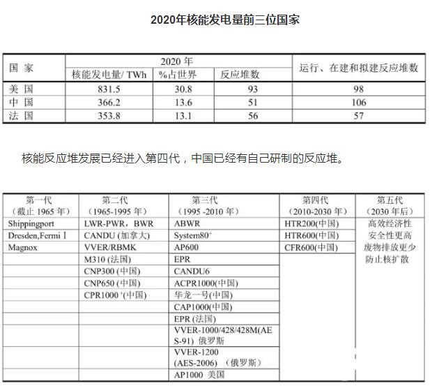 核能發電是解決2050年全球達到二氧化碳排放為零的重要支柱。20世紀60年代中國核能發電量為零,到1993年中國核能發電才開始有1.6TWh,占全球總量的0.007%;根據BP2021年報告,到2020年中國核能發電量達到366.2 TWh,占全球總量的13.6%。2020年中國居世界第二位,僅次于美國30.8%。但是中國運行、在建和擬建反應堆數將超過美國。