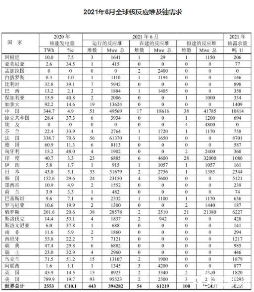 表中“%e”表示核能發電占發電總量的百分率。全球核能發電占全球發電總量的10.1%,其中法國高達70.6%。本數據是世界核能協會WNA 2021年1月份提供的數據。