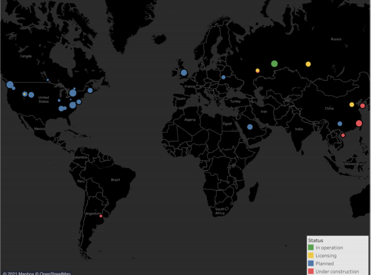 全球正在實施的先進堆項目的位置和狀態(綠色,運行中;橘黃,取照中;藍色,規劃中;淡紅,建造中)[1]