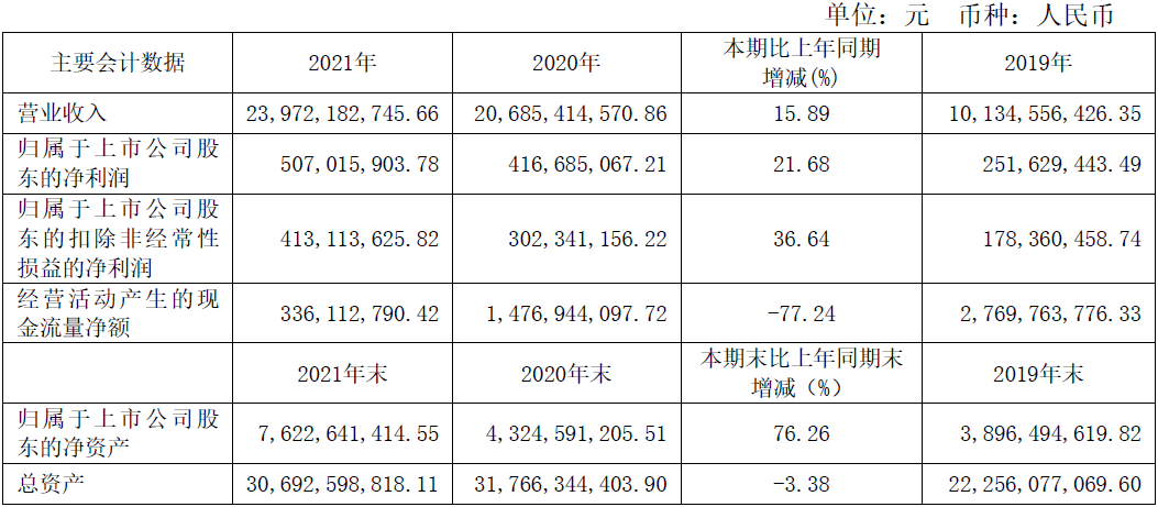 2021年度,公司實現營業收入239.72億元,較上年同比增長15.89%,歸屬于上市公司股東凈利潤為5.07億元,較上年同比增長21.68%。報告期內公司新增訂單3010.9MW,累計在手訂單7945.5MW。報告期內,公司實現銷售風機1084臺,其中陸上風機384臺,海上風機700臺。