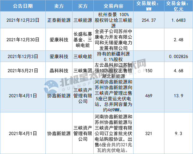 除了自主開(kāi)發(fā)之外,三峽集團(tuán)也在陸續(xù)收購(gòu)優(yōu)質(zhì)電站資產(chǎn),據(jù)北極星太陽(yáng)能光伏網(wǎng)統(tǒng)計(jì),2021年三峽已收購(gòu)了超1GW的光伏電站,交易對(duì)象包括正泰、愛(ài)康、協(xié)鑫新能源、晶科等企業(yè)。