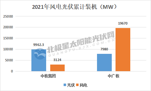 從中廣核和中核的風(fēng)光版圖來(lái)看,二者光伏裝機(jī)較為相近而風(fēng)電裝機(jī)差距較大。