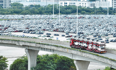 7月6日,一輛滿載新能源汽車的貨車,從廣西柳州汽車城的一家物流基地旁經過。