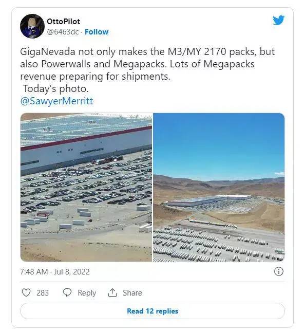 一位名叫OttoPilot的Twitter用戶操作無人機(jī)飛過內(nèi)華達(dá)州Gigafactory,在工廠外發(fā)現(xiàn)了數(shù)量驚人的特斯拉Megapack。