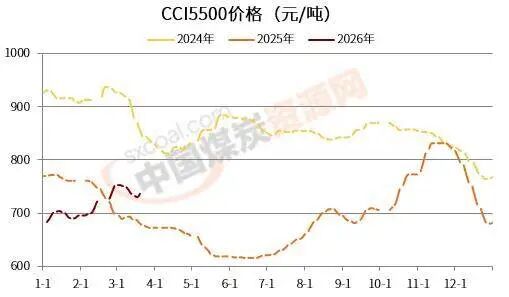 近日,港口動力煤價格繼續上漲。中國煤炭資源網數據顯示,截至3月23日,CCI5500報收于742元/噸,CCI5000為660元/噸,CCI4500為573元/噸,均較上一期上漲6元/噸,漲幅有所擴大;本輪上漲以來,累計漲幅分別為12元/噸、12元/噸、15元/噸。