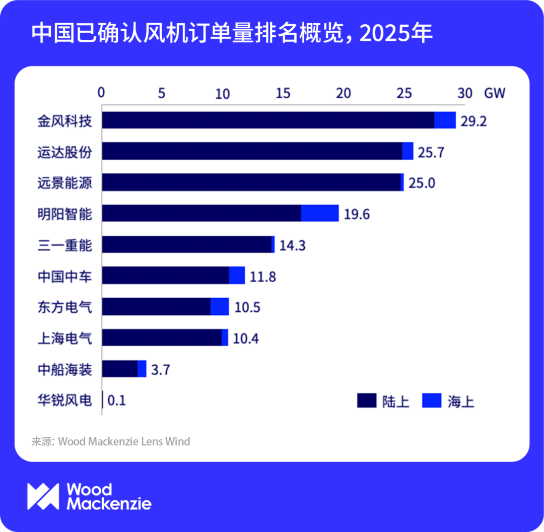 運達股份(25.7GW)和遠景能源(25.0GW)緊隨其后,排名前三的整機商市場份額合計超過50%。