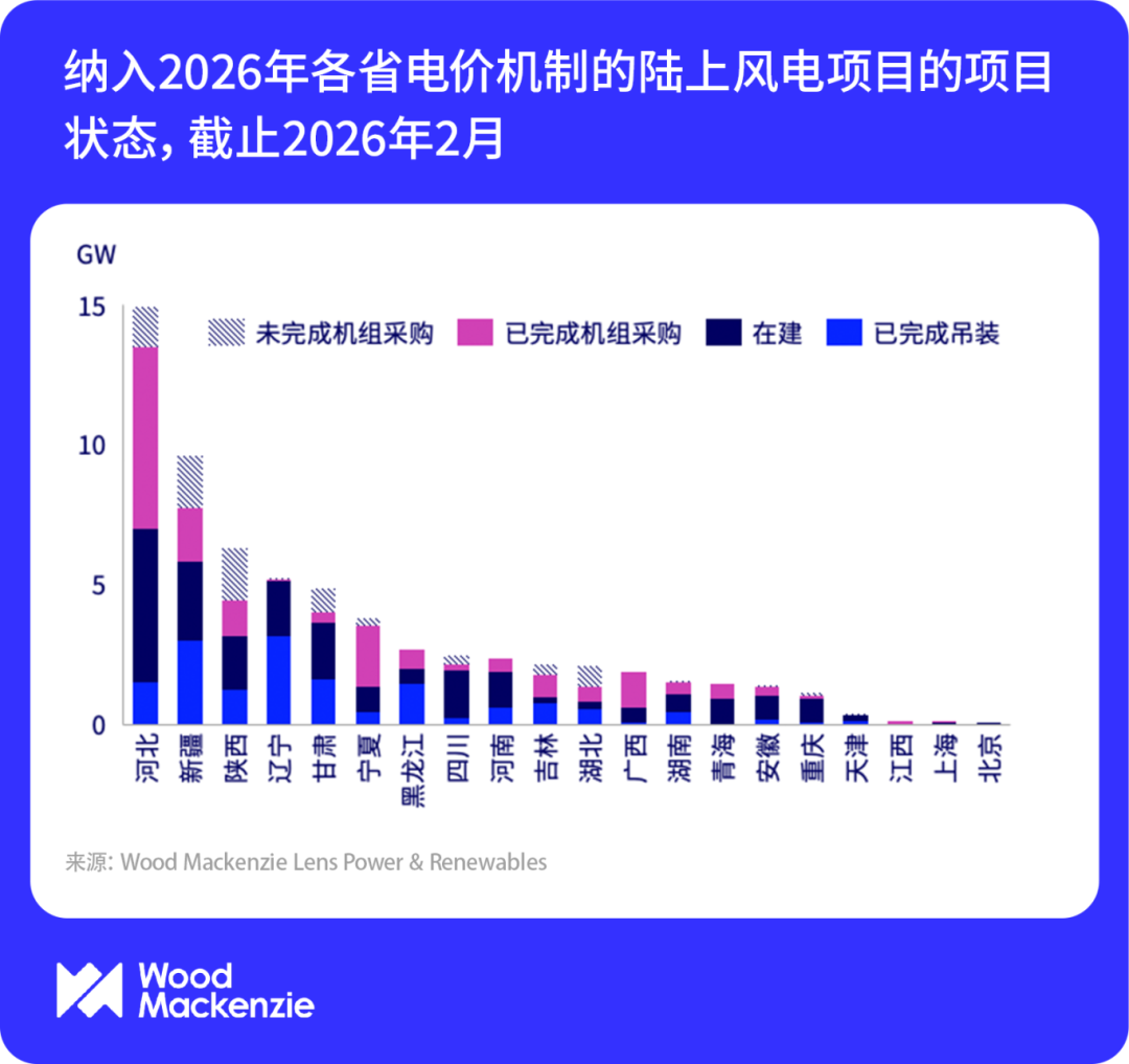 根據伍德麥肯茲統計,截止2026年2月,已公布的各省2026年電價機制共覆蓋67.5GW陸上風電項目,預計將占到中國2026年風電新增裝機的一半以上。其中,仍有13%的項目容量仍未完成機組采購。