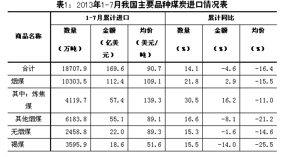 據(jù)海關(guān)信息網(wǎng)統(tǒng)計(jì),今年1-7月,我國(guó)進(jìn)口煤1.9億噸,增加14.1%;價(jià)值169.6億美元,下降4.6%;進(jìn)口平均價(jià)格為每噸90.7美元,下跌16.4%。