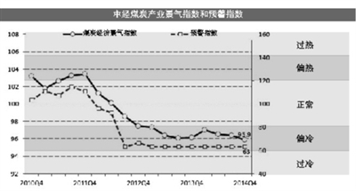 2014年中經(jīng)煤炭產(chǎn)業(yè)景氣指數(shù)(由經(jīng)濟日報社中經(jīng)產(chǎn)業(yè)景氣指數(shù)研究中心和國家統(tǒng)計局中國經(jīng)濟景氣監(jiān)測中心共同編制)較2013年微跌0.2點,景氣值為95.9,繼續(xù)維持低位運行,預警指數(shù)連續(xù)8個季度走平(63)。