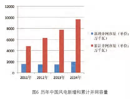 圖5顯示的是歷年中國風電上網電量占全國發電量的比例,由2011年的1.67%到2014年2.8%,呈現逐年增加的趨勢。