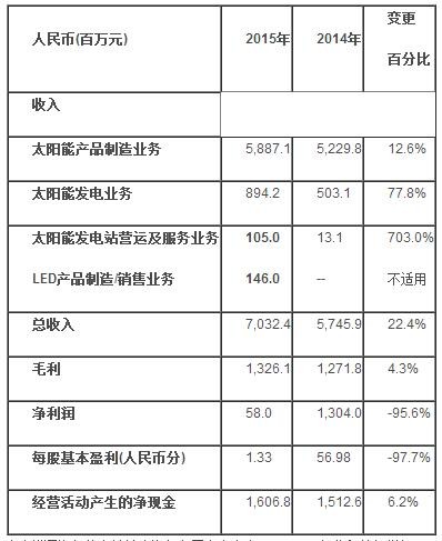 2015年,本集團收入為人民幣7,032.4百萬元,較去年增長22.4%,主要由于太陽能產品銷售增長及太陽能發電收入上升所致。2015年凈利潤為人民幣58百萬元,較2014年的人民幣1,304百萬元低。凈利潤減少的主要原因是太陽能產品平均售價下調、限電對太陽能發電站的發電收入所造成的影響、拓展國際市場業務帶來的分銷及行政開支上升,以及人民幣兌主要貨幣貶值導致的匯兌損失增加。
