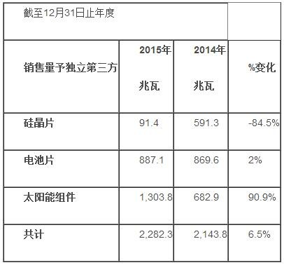 集團面向中國及國際市場的客戶制造及銷售太陽能硅晶片、電池片和組件產品。截至2015年12月31日止年度,太陽能產品的銷售量達2,282兆瓦,較去年同期的2,144兆瓦增加6.5%。集團提升了太陽能組件相對太陽能矽晶片銷售的比例,部分抵消了太陽能產品平均售價下調的影響。2015年,銷售給第三方的太陽能組件由2014年的682.9兆瓦上升至1,303.8兆瓦,增長了90.9%。