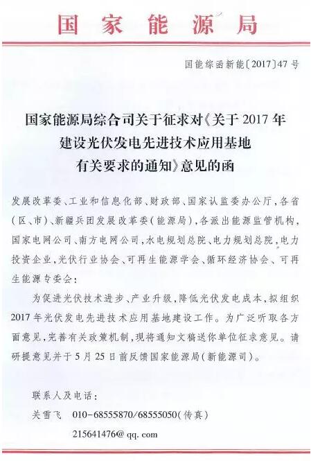 國家能源局綜合司于近日印發《關于2017年建設光伏發電先進技術應用基地有關要求的通知》(征求意見稿),指出2017年光伏發電先進技術應用基地共計建設8-10GW,每個基地本期建設規模不小于500MW,最大1GW。已建成未驗收以及在建基地所在市(縣)級區域不安排新建基地。每個省(區、市)可申報3個基地,總規模不超過2GW。2016年光伏發電未達到最低保障小時數的省(區、市)不得申請。