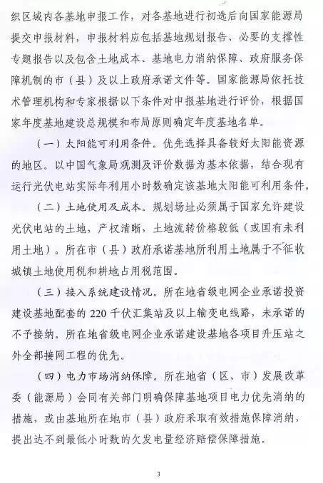 每個省(區(qū)、縣)可申報3個基地,總規(guī)模不超過2G瓦。2016年光伏發(fā)電未達到最低保障小時數的省(區(qū)、縣)不得申請。已建成未驗收以及在建基地所在市(縣)級區(qū)域不安排新建基地。